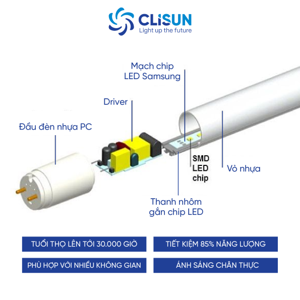 Tuổi thọ của đèn LED T8 CLISUN đạt tối đa lên đến 30.000 – 50.000 giờ (tùy model), gấp nhiều lần so với đèn huỳnh quang.